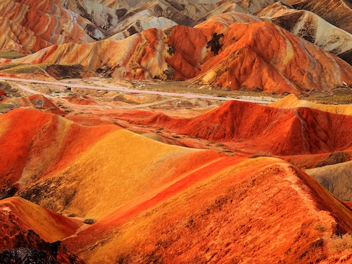 -  (Zhangye Danxia Landformתצורת נוף ייחודית המכונה דַנְשְׂיָה, ובה שכבות סלע ואדמה בגוונים עזים של אדום, צהוב וכתום.
