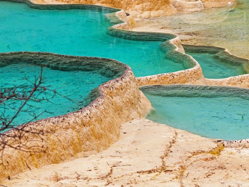 מצ’נגדו נצא ברכבת מהירה אל אזור חואנג לונג, אתר טבע ייחודי שבו בריכות טרברטין בגוני טורקיז ולבן משתרעות למרגלות הר “הדרקון הצהוב”, המתנשא לגובה של כ-5,500 מטרים.